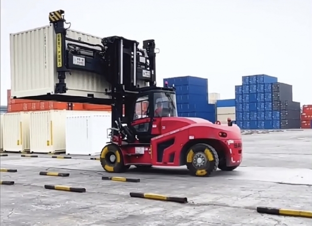 ・定格荷重:16トン ・設備本体総重量:2.4トン ・納 期:6か月日本港着可能 ・サービス体制:近くでWWB技術者が待機中 ・部品調達:こちらも対応迅速 (関東と関西にて部品センター設置予定) ・生産量:1台/日生産中、受注生産ではない ・特徴:16トン級の電動仕様フォークリフト車体に、空コン用のアタッチメントを着用したもの ・導入実績:200台あり