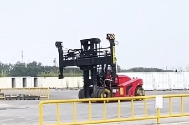 ・定格荷重:16トン ・設備本体総重量:2.4トン ・納 期:6か月日本港着可能 ・サービス体制:近くでWWB技術者が待機中 ・部品調達:こちらも対応迅速 (関東と関西にて部品センター設置予定) ・生産量:1台/日生産中、受注生産ではない ・特徴:16トン級の電動仕様フォークリフト車体に、空コン用のアタッチメントを着用したもの ・導入実績:200台あり